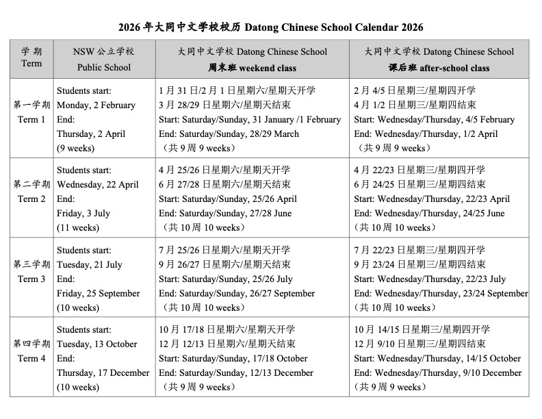 2026 年大同中文学校校历 Datong Chinese School Calendar 2026